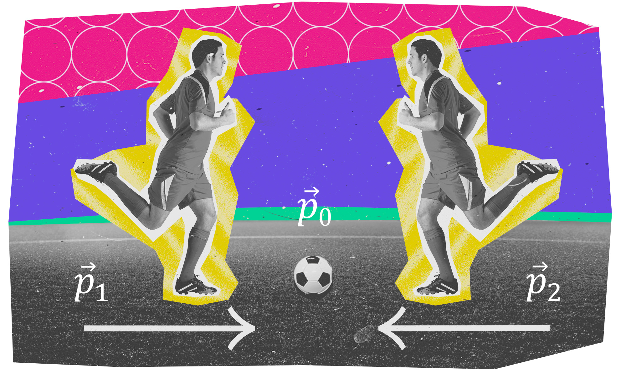 Se i giocatori hanno la stessa massa e si muovono con velocità uguale in modulo, allora la quantità di moto totale del sistema \(\vec{p}_{\text {tot }}\) è nulla. Infatti il pallone è fermo, quindi la sua quantità di moto \(\vec{p}_{0}\) è nulla, mentre i due giocatori hanno quantità di moto \(\vec{p}_{1}\) e \(\vec{p}_{2}\) con i due vettori che hanno lo stesso modulo, la stessa direzione e il verso opposto. Sommati, restituiscono il vettore nullo.